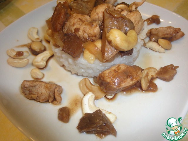 К этому времени рис сварился. Выкладываем его на тарелку, следом кладем курицу с кешью.