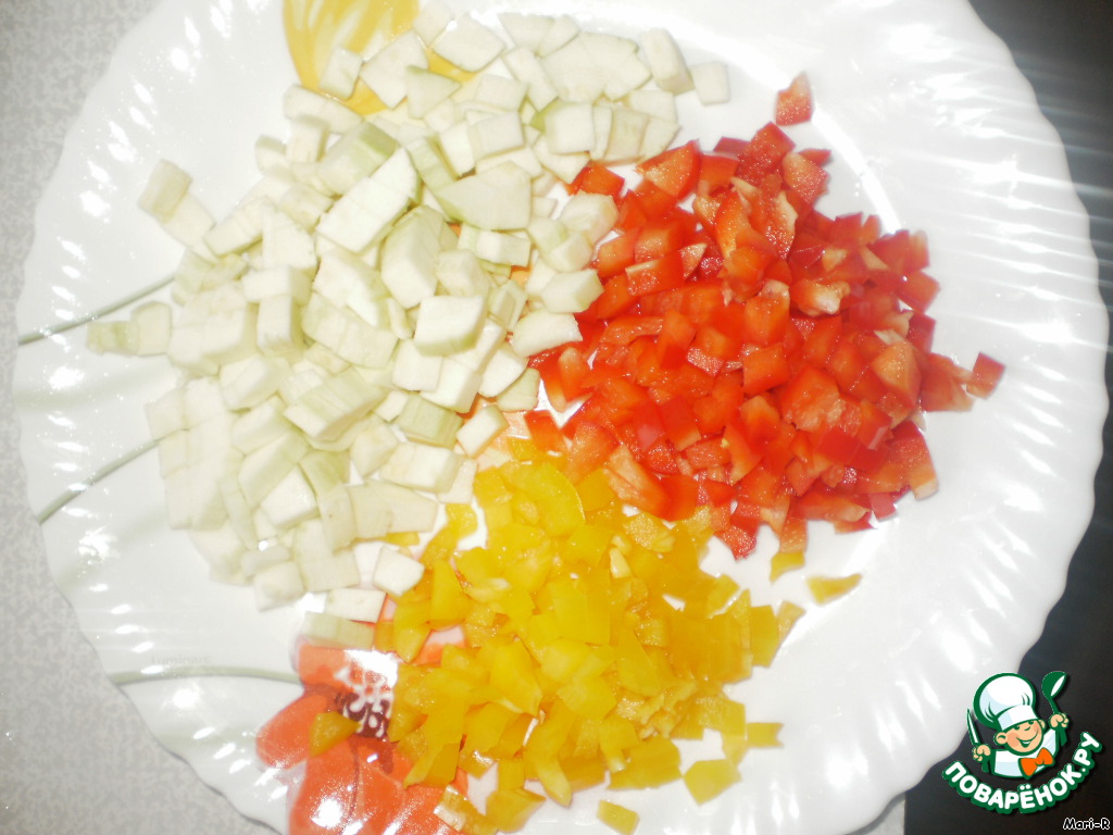 Нарезать паприку и цуккини. Добавить к курице, залить водой. Посолить.