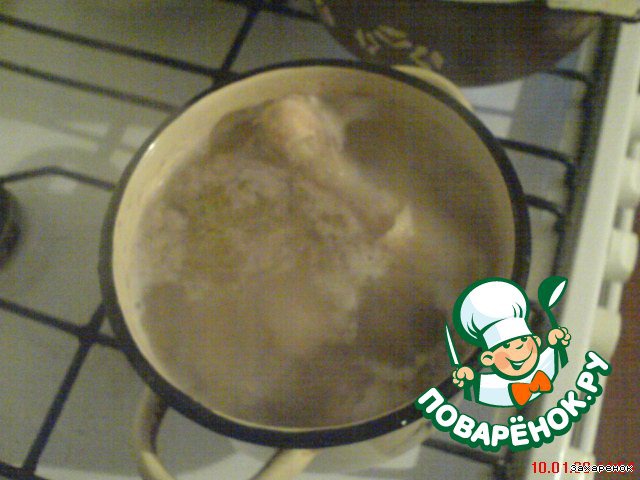Окорочок моем, снимаем с него кожу, кладем в кастрюлю, заливаем холодной водой и варим до готовности, не забывая снимать пену.
