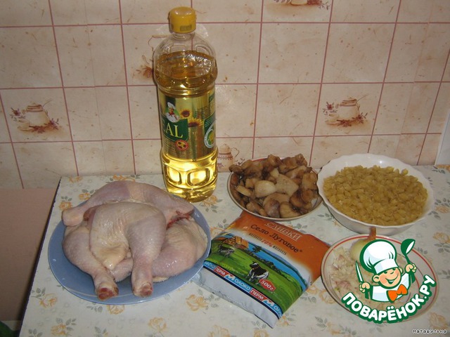 Готовим продукты, моем курочку, чистим лук, размораживаем грибы.