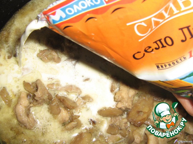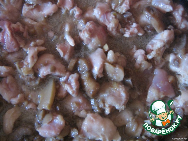 Добавляем кусочки курочки, закрываем крышкой и тушим минут 15.
