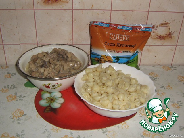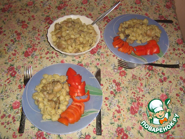 смешиваем курицу с грибами и ракушки, которые мы отварили, пока курочка тушилась.