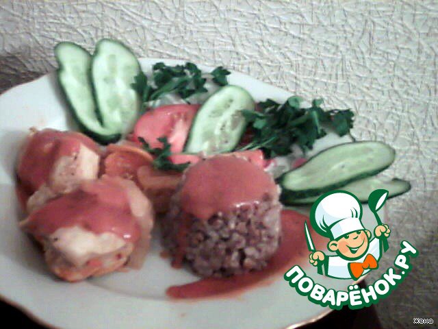 При подаче выкладываем гарнир ( у меня гречка на пару) пару кусочков грудки + соус + украшения из зелени и...