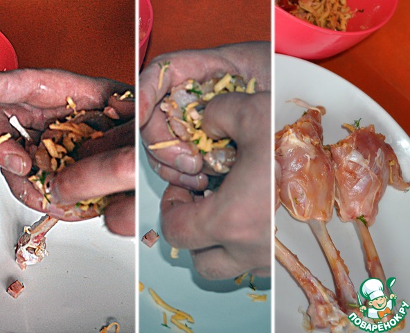 Плотно набиваем голени фаршем, оставляя свершу немного свободного места. чтобы сыр при жарке не вытекал.