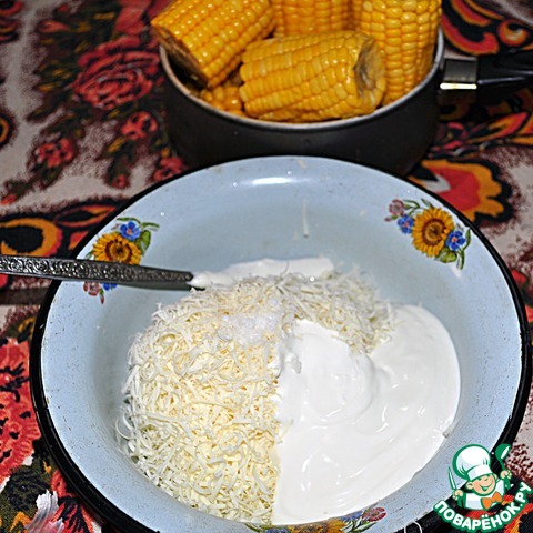 Выложите на решетку половинки предварительно отваренных початков кукурузы. Когда появятся подпалины - переверните и выложите на них по столовой ложке сырно-сметанной смеси.