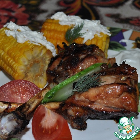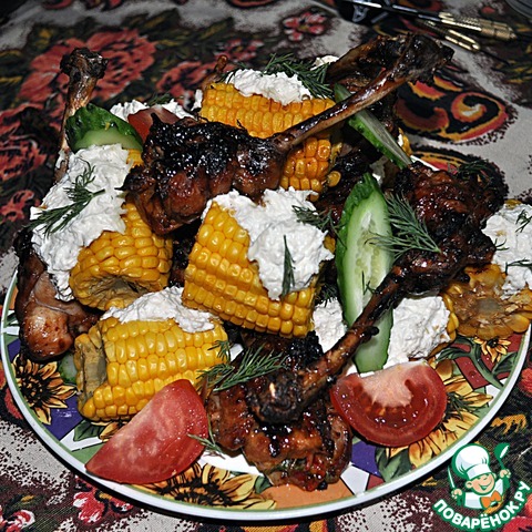 | Куриные голени, фаршированные сыром, чесноком и маринованным перцем. Подаются с кукурузными початками, обжаренными на гриле. |