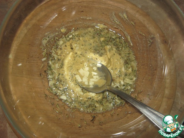 Начинаем с маринада - очистить и измельчить чеснок. Соединить его с горчицей (можно использовать горчицу в зернах для пикантности). Посолить по вкусу, добавить любимые сушеные травы и ром. Перемешать.