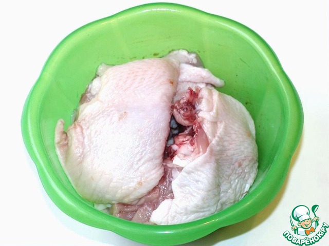 Моем, сушим и разделяем на две части куриные окорочка.