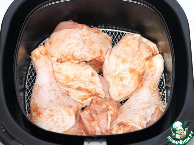 Затем маринуем в полученном соусе кусочки курицы минут 10.