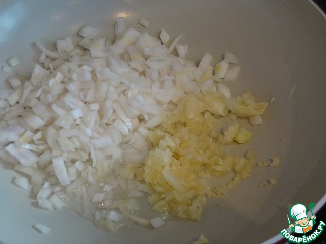 Почистите и порежьте лук, почистите и раздавите чеснок. У меня был очень крупный чеснок, поэтому я взяла только два зубчика.