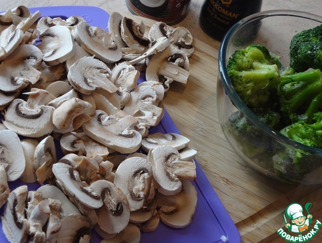 Протрите грибы влажной салфеткой, крупно нарежьте. Промойте брокколи и разберите её на соцветия. Я использовала замороженную брокколи. Замороженную брокколи предварительно необходимо разморозить.