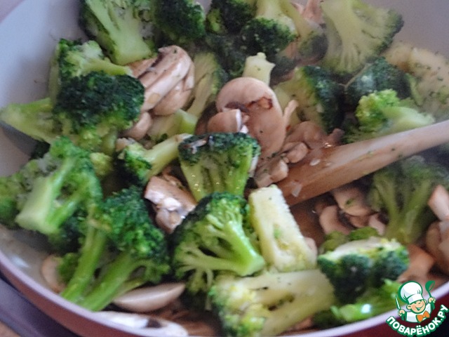 Положите брокколи и грибы в вок и жарьте еще несколько минут, не переставая помешивать.