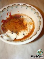 Делаем соус: смешиваем майонез и кетчуп, кидаем приправу и выдавливаем сок из лимона и чеснок в соус, хорошо перемешиваем.