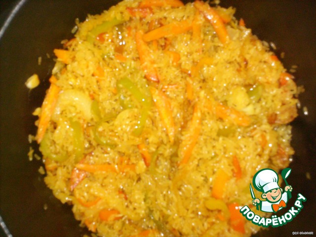 Высыпаем рис, промытый и подсушенный, обжариваем, размешивая 1-2 минуты.