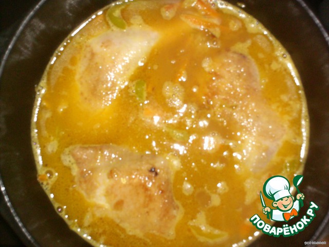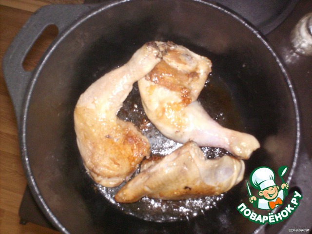 Окорочка слегка присаливаем и обжариваем на 1 ложке растительного масла 10 минут с одной стороны и 7 минут с другой.