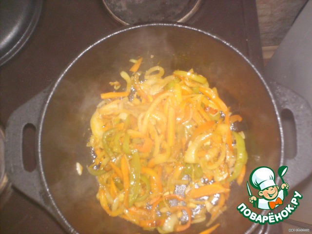 Овощи нарезаем длинными ломтиками, морковь, лук – полукольцами, соломкой - перец и чеснок – кружочками.