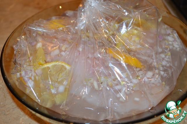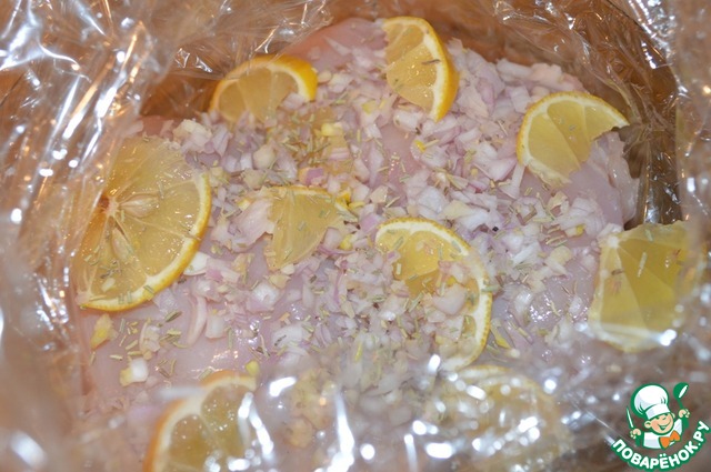 С грудки снимаем кожицу, удаляем кости. Подготовленное таким образом филе кладем в прочный пакет, я использую пакет для запекания. Лук и чеснок измельчаем, добавляем розмарин и слегка толчем ступкой, лимон режем на небольшик кусочки. Все складываем к филе.