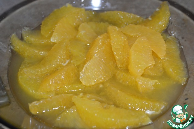 С апельсинов острым ножо срезаем кожуру, затем вырезаем дольки. Делаем это над тарелкой, чтобы сохранить сок. Готовые дольки кладем в сок.
