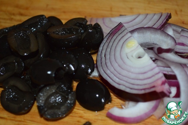 Лук чистим и нарезаем тонкими полукольцами, маслины режем пополам.
