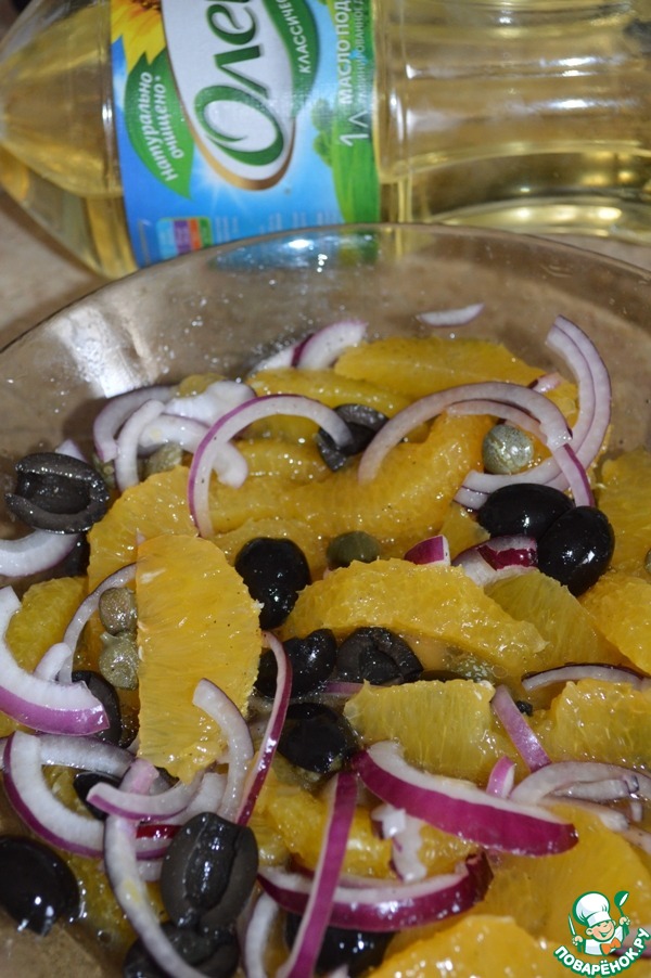 Соединяем в миске апельсины, маслины, каперсы и лук. приправляем перцем и поливаем расительным маслом. Оставляем на 10 минут настояться. Затем посыпаем щепоткой растертой между пальцами зиры.