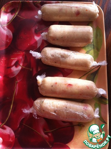 С помощью пищевой пленки сформировать колбаски. У меня получилось из 300 гр. филе 5 колбасок.