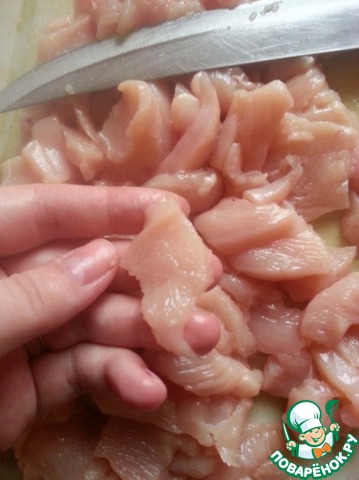Для начала займемся нашим куриным филе. Порежем его на тонкие, маленькие пластиночки. Мясо в китайских блюдах готовится очень быстро, оставаясь сочным внутри и хрустящей золотистой корочкой снаружи.