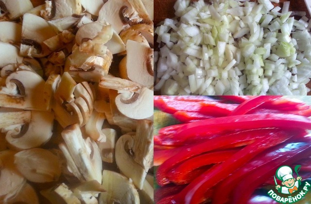 Подготовим овощи. Грибы нарежем некрупными пластинками, лук мелко нашинкуем, перец тонкими полосками