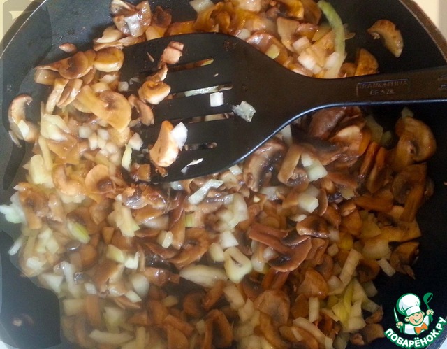 Грибы с луком обжарим до готовности (минут 15-20) на смеси растительного и сливочного масел, перец обжарим отдельно 1-2 минутки.