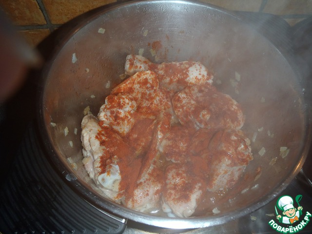 Потом прямо на лук выкладываем курочку и поджариваем ее со всех сторон