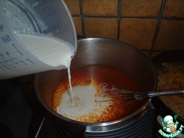Берем сливки и примерно 4 ложки муки + сливки, перемешиваем и выливаем в соус, надо его загустить,