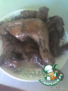 Затем сделать надрезы в мясе и смазать медом. Выложить обратно в сковороду, залить вином, я брала 0,5 стакана, и протушить до испарения жидкости. Цыпленок приобретает бордовый цвет, очень красиво.