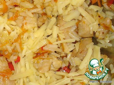 В этом же масле слегка обжариваем натёртую морковь и мелко нарезанный сладкий перец. Объединяем с рисом, добавляем натёртый сыр и измельчённый чеснок. Всё это солим, посыпаем специями и перемешиваем.