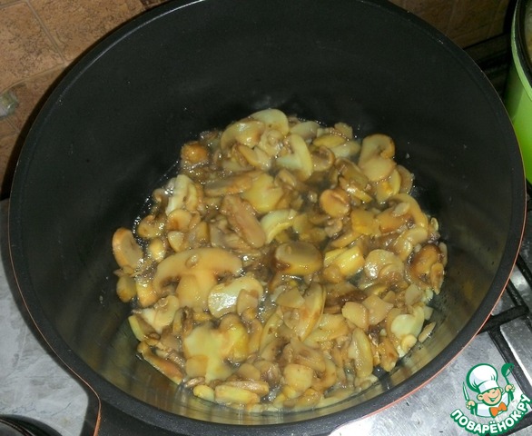 Обжарим грибы. Я делала это прямо в кастрюле. Грибы выделят много жидкости, особенно если вы использовали замороженные, как я. Но грибной бульон нам еще пригодится в конце, когда мы будем добавлять рис. Если вы жарили на сковороде, переложите в кастрюлю вместе с бульоном.