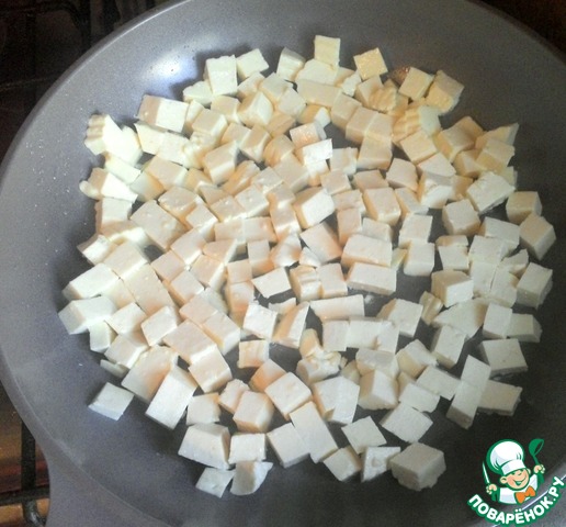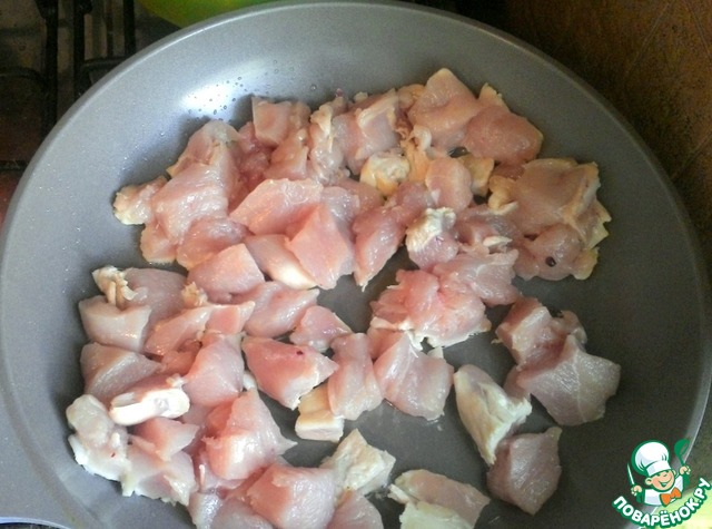 Режем курочку на кубики, слегка обжариваем до белого цвета со всех сторон.