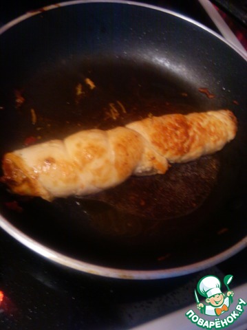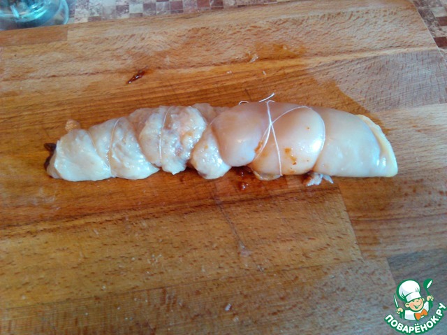 Свернуть рулетом и обвязать нитками. В таком виде завернуть рулет в плёнку и убрать в холодильник.