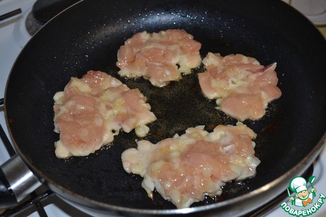 Столовой ложкой на разогретую сковороду выложить биточки. Разровнять ложкой. Обжарить с двух сторон.
