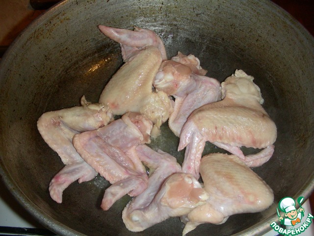 Нагреваем растительное масло в казанчике и слегка обжариваем куриные крылышки. Тушим на маленьком огне 20 мин., немного солим.