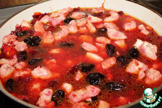 Чернослив хорошо промыть водой. Добавить его к овощам и курице. Жарить 2 минуты.