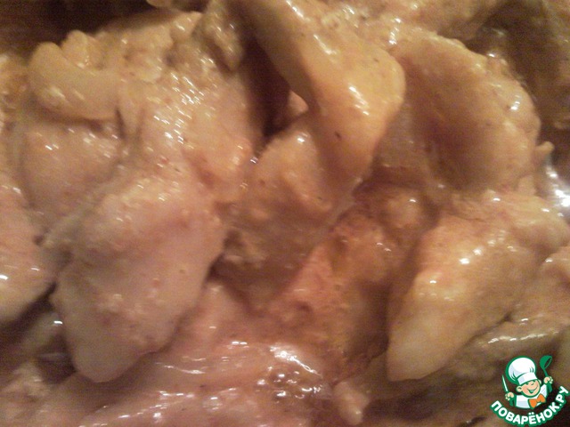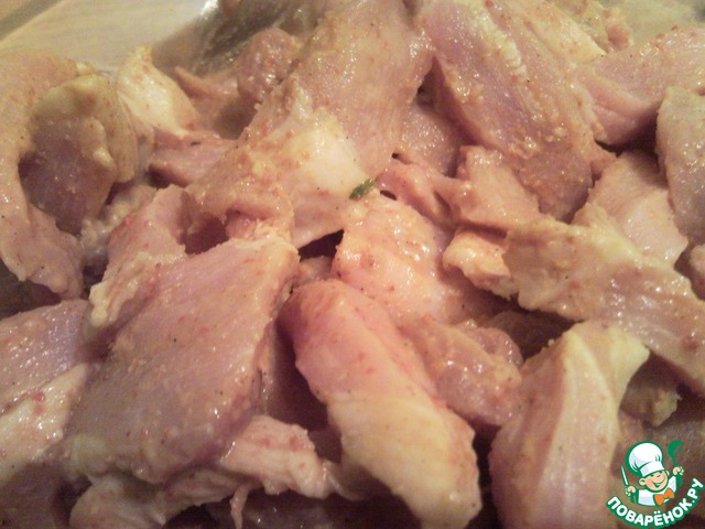 Куриное филе и свинину порезать на кусочки/полосочки. Укладываем в РАЗНЫЕ ёмкости для маринования (свинину отдельно, курочку отдельно). Добавляем горчицу, соль и специи. Все хорошенько, но аккуратно, ручками перемешиваем, чтобы каждому кусочку досталась своя доля приправы и горчицы. Все оставляем мариноваться на любое количество времени (чем дольше, тем лучше).