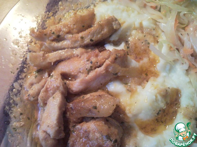 Всё готово! И теперь с любым гарниром (у меня пюре картофельное + квашеная (домашняя) капустка). Домашние не поняли, что ели свинину + курицу. Приятного аппетита! Это мой 1-й рецепт на поваренке, буду ждать ваших комментариев!