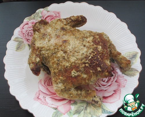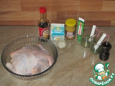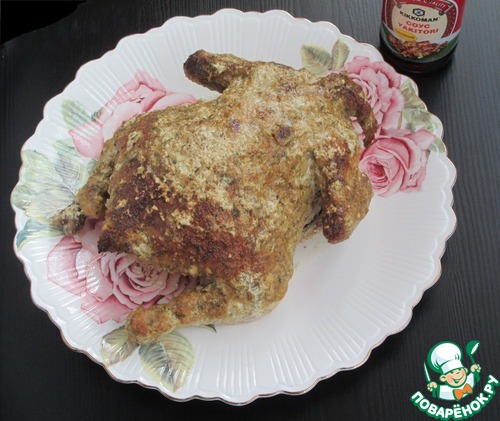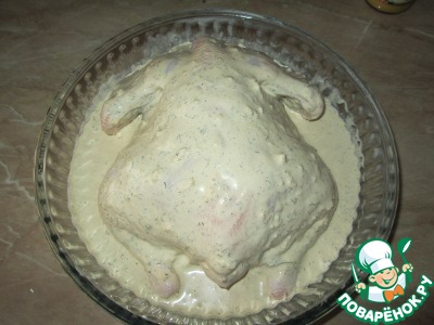 Обмазываем тушку курицы снаружи и изнутри маринадом, оставляем на 1 час. Затем отправляем в разогретую до 180 градусов духовку на 1 ч - 1ч.20 мин. В процессе не забываем поливать курочку соком. Готовность проверяем сделав проколы ножом. Если вытекает прозрачный сок - курица готова.