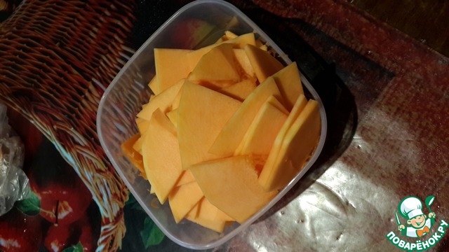 Очищаем тыкву от кожуры и нарезаем тонкими ломтиками.