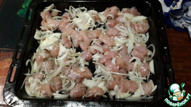 На противень выкладываем курочку с луком и поливаем половиной смеси йогурта и молока.