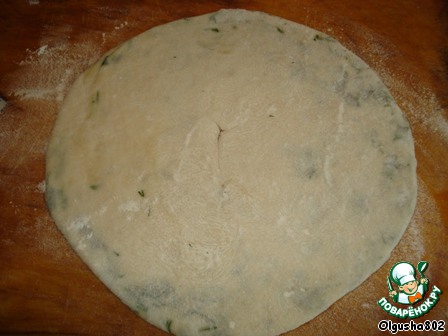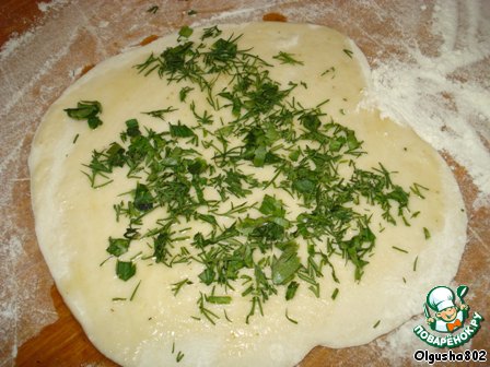 3. Готовим лепешки с зеленью: муку смешиваем с 1 стаканом воды, добавляем соль по вкусу и замешиваем не очень крутое тесто. оставляем под крышкой на 30 минут. Затем делим его на 6 частей и каждую тонко раскатываем. Лепешки смазываем растительным маслом, посыпаем рубленой зеленью, сворачиваем рулетом, затем "улиткой" и очень тонко раскатываем. Выпекаем на сухой сковороде под крышкой с обеих сторон. Готовые лепешки выложить на доску и укрыть полотенцем.