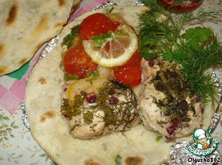 | Восхитительная идея для дружеской встречи на природе! Удивительно нежная курочка, запеченная в фольге, прекрасно гармонирует с заливными помидорками-черри и лепешками с зеленью. |