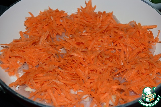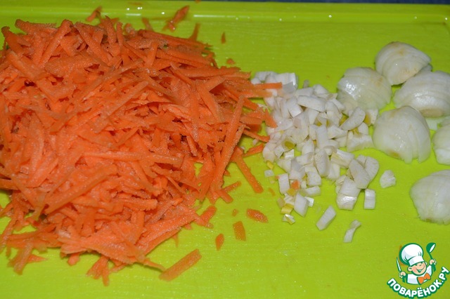 Лук нарезать полукольцами, чеснок кубиком. Морковь натереть на терке.