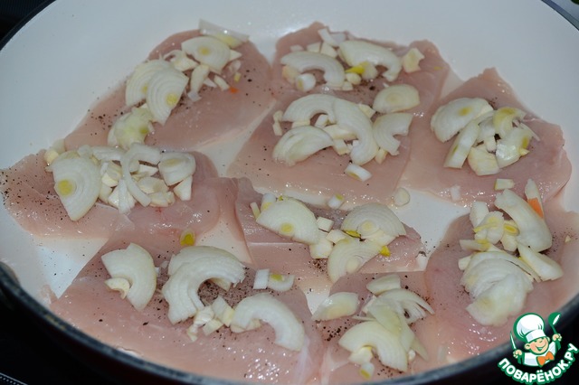 Грудку куриную нарезать небольшими тонкими кусочками. Поперчить и посолить. Курицу выложить в сковороду, посыпать чесноком и луком.