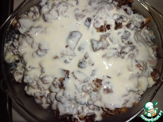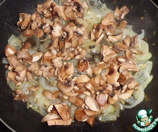 Обжариваем лук, нарезанный полукольцами, с добавлением грибов, до полуготовности. Солим, перчим.