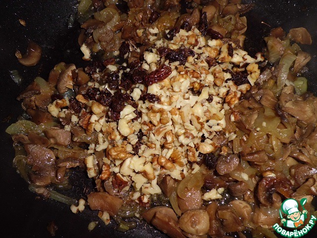 Добавить орехи и изюм, мелконарезанные. Перемешать и сразу выключить.