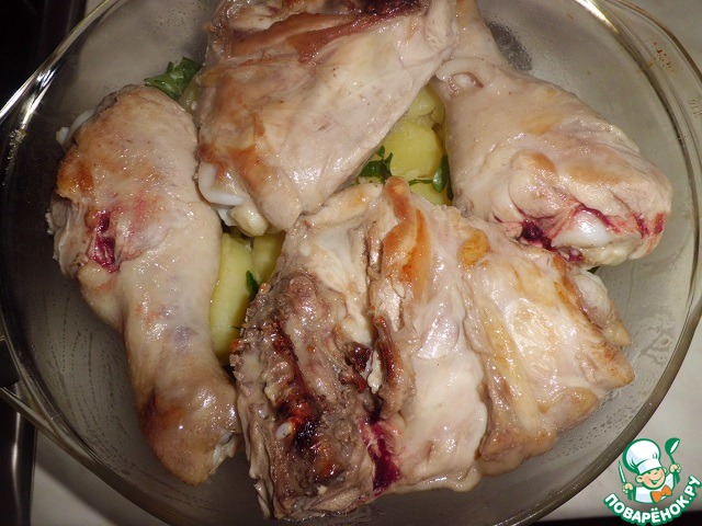 Хочу отдельно остановиться на картошке. В самом рецепте она отсутствует и курица готовится без нее. Но в целях экономии своего времени, я решила сделать 2 в 1 (тем более очень люблю подобные блюда).